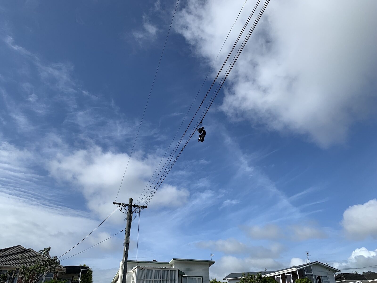 「ん?電線に何か引っかかってない?」「靴??」