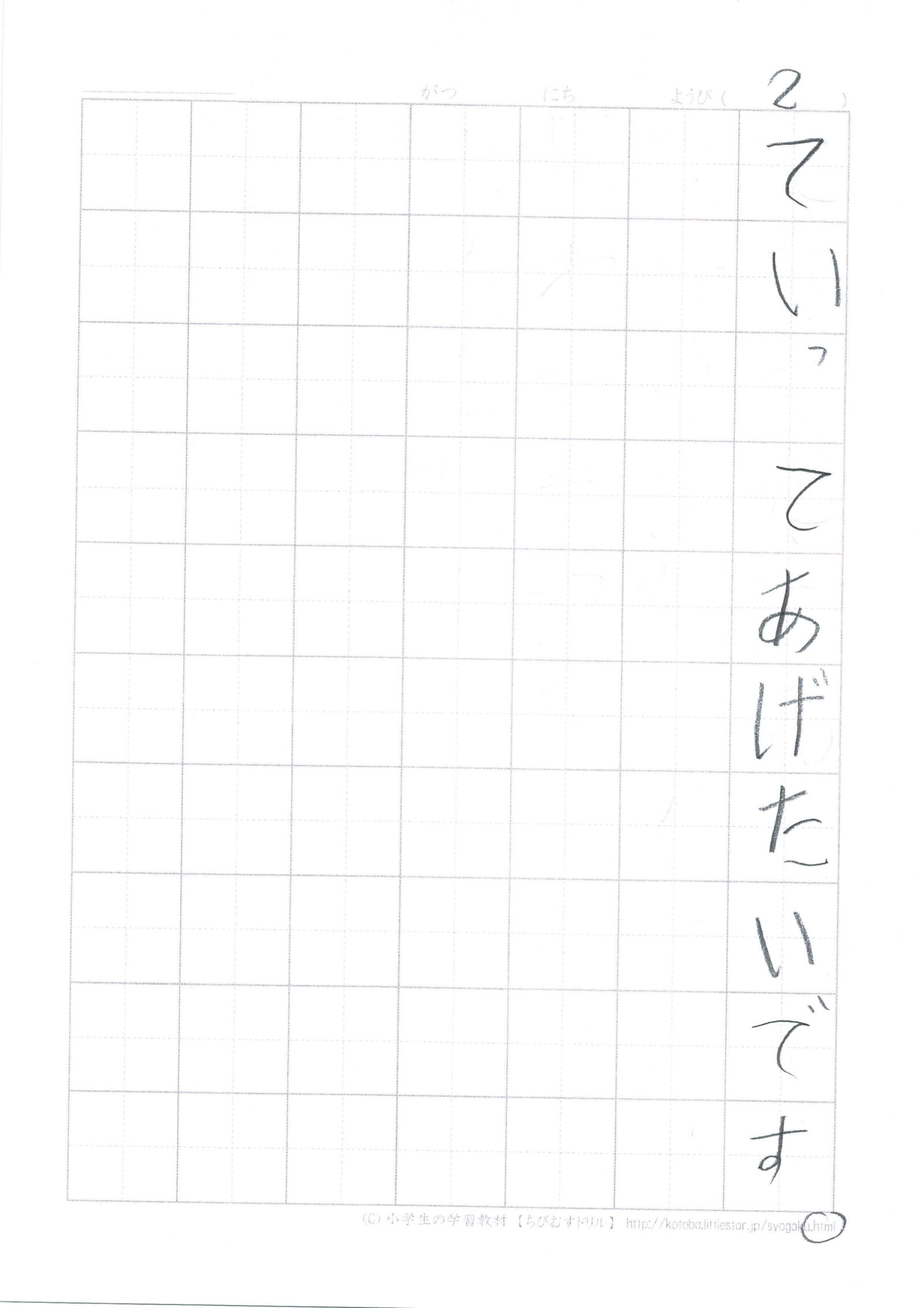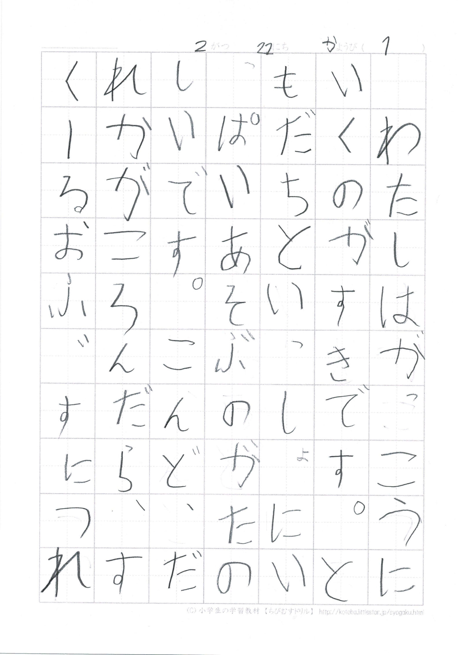 わたしはがっこうにいくのがすきです。ともだちといっしょにいっぱいあそぶのがたのしいです。こんど、誰かがころんだら、すくーるおふぃすにつれていってあげたいです。