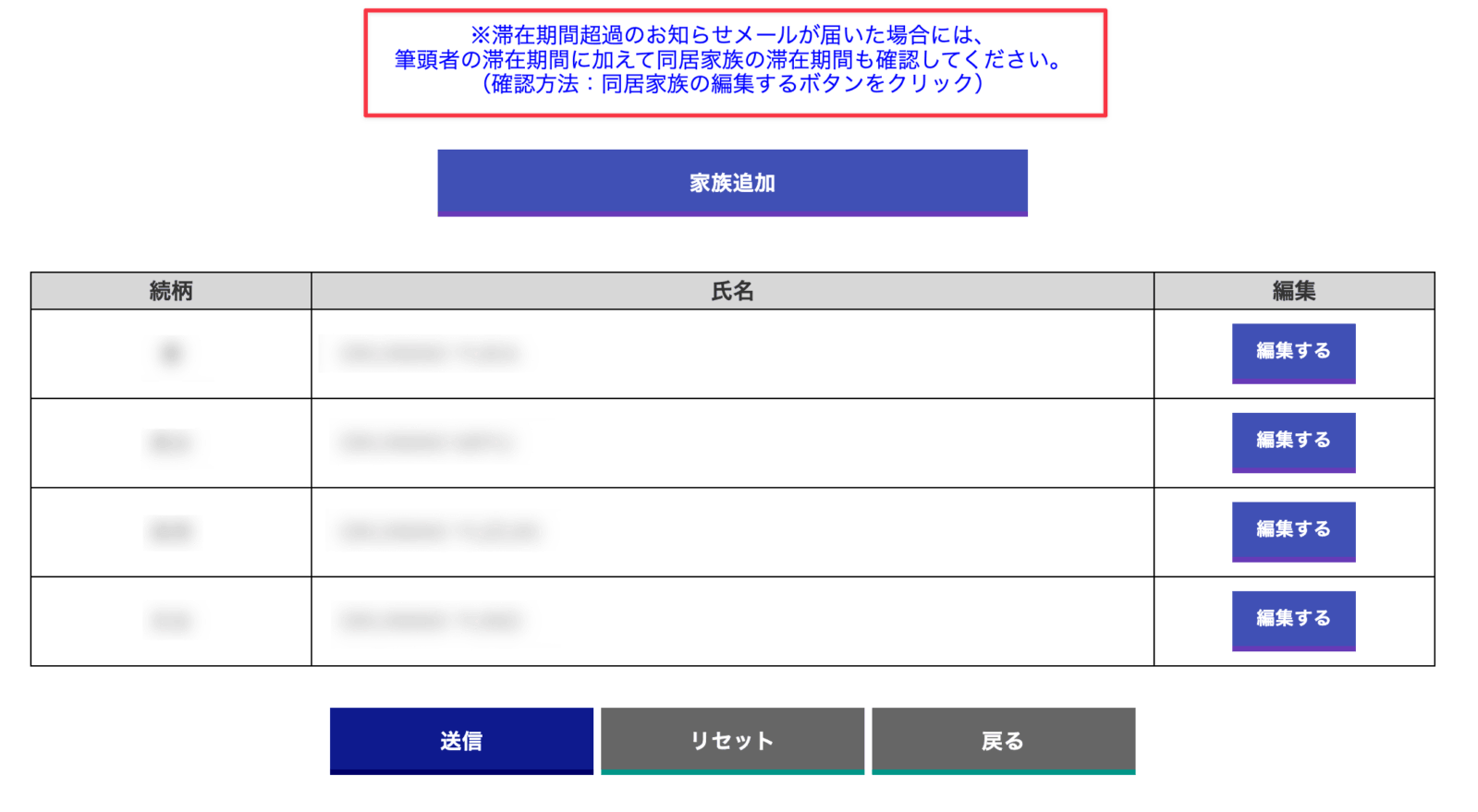 ※同居家族の方の滞在期間が未記入、もしくは過ぎているために、本メールが継続して届く例が少なくありません。必ず同居家族の方全員の滞在期間もご確認願います。