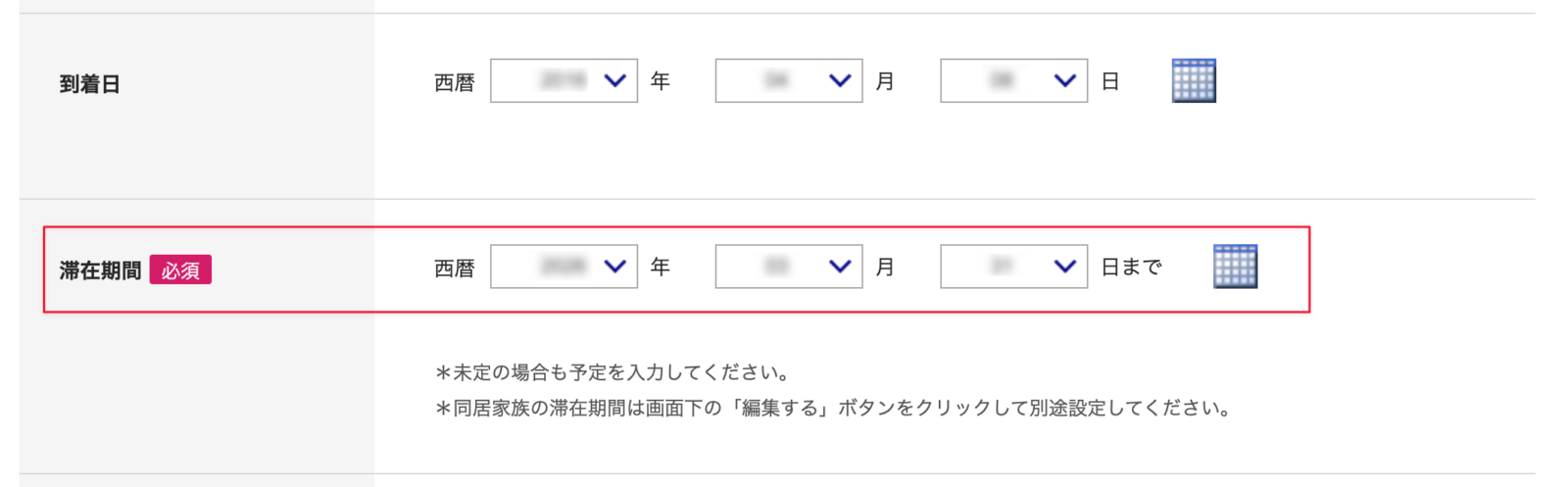 これでした。家族それぞれの「編集する」ボタンをクリックして情報を見てみると、滞在期間の「年」が空になっていました。