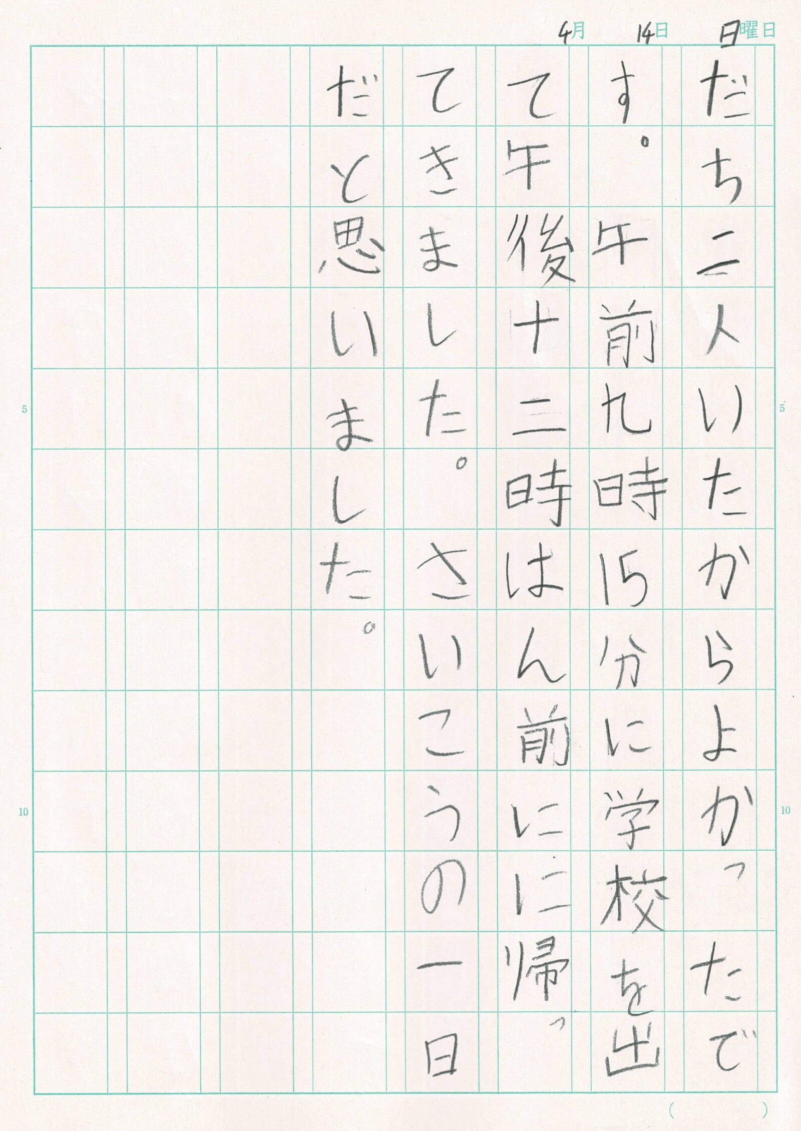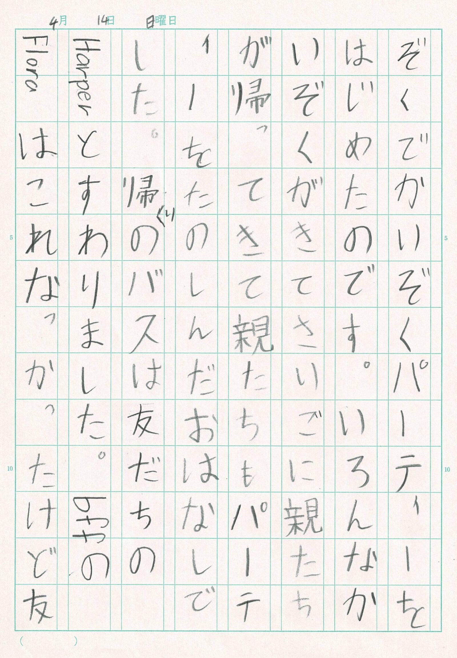 帰りのバスは友だちのハーパーとすわりました。BFF(親注:Best Friend Forever)のフローラは来れなかったけど友だち二人いたからよかったです。午前九時十五分に学校を出て午後十二時半前に帰ってきました。さいこうの一日だと思いました。