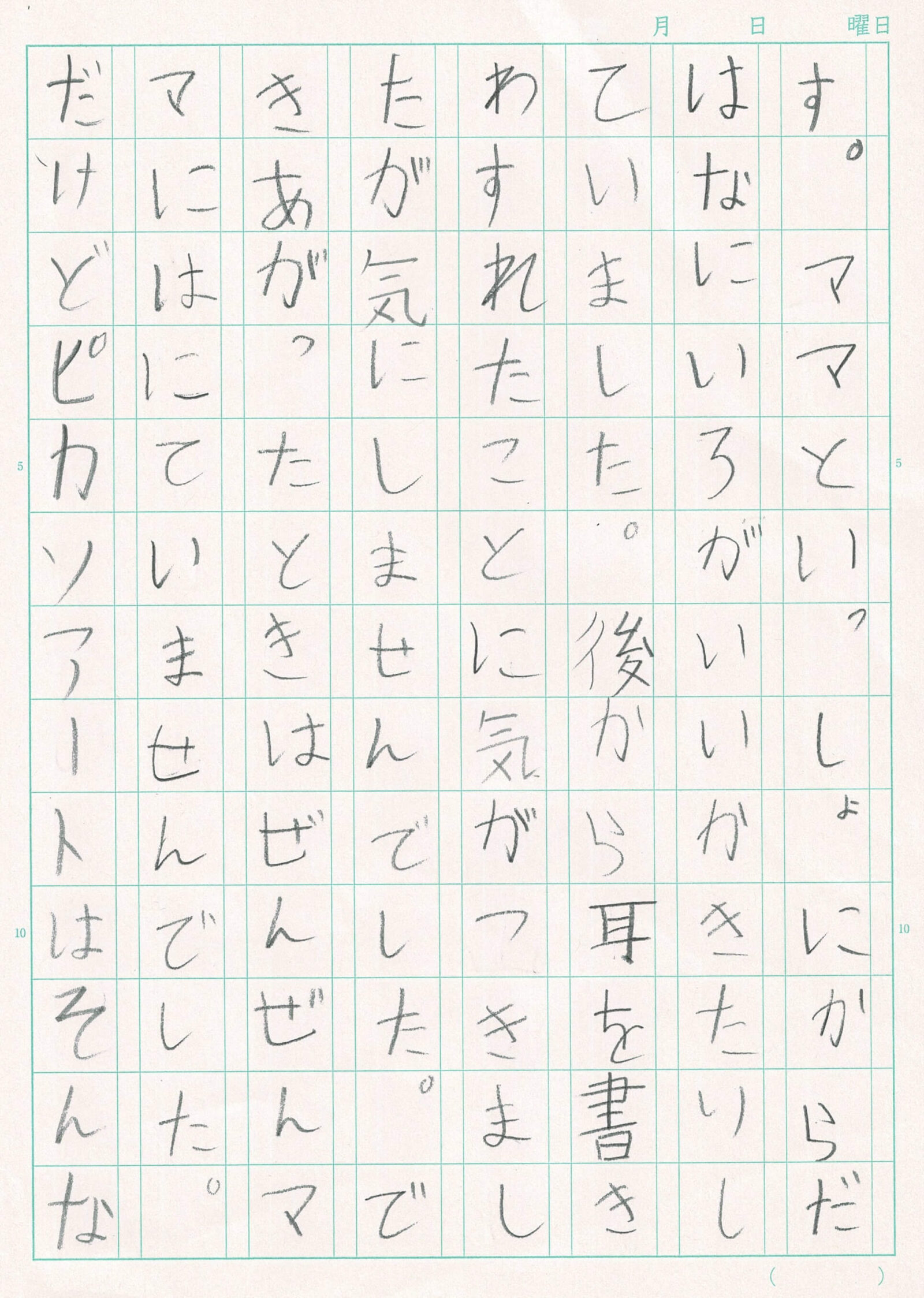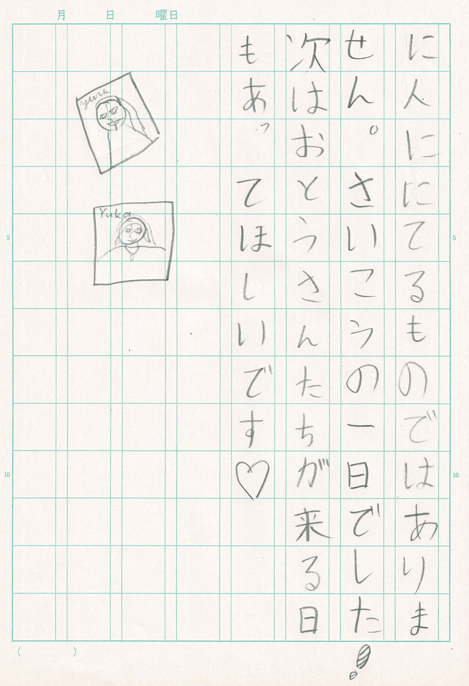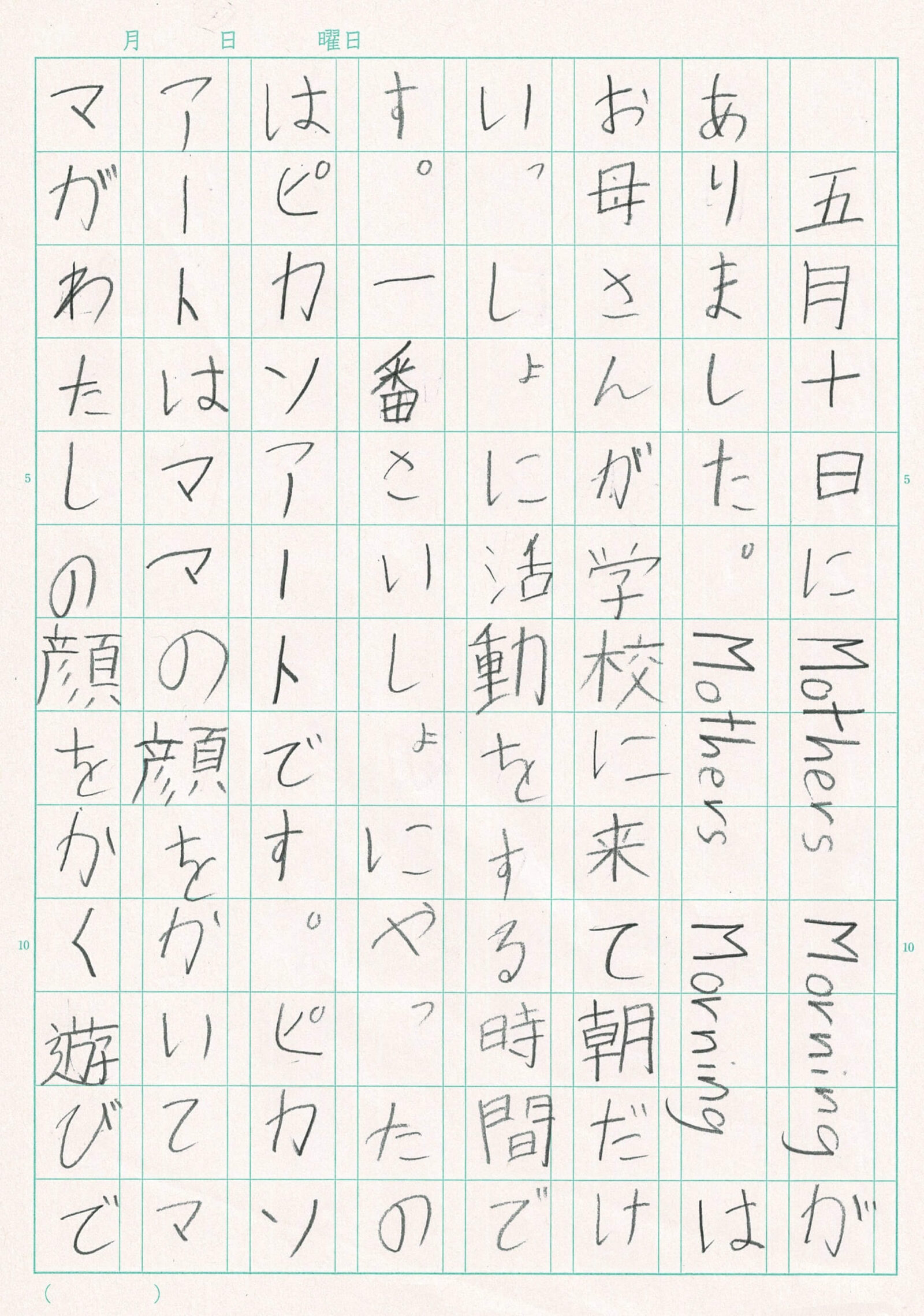 五月十日にMothers Morningがありました。Mothers Morningはお母さんが学校に来て朝だけ一緒に活動をする時間です。一番最初にやったのはピカソアートです。ピカソアートは(私が)ママの顔を描いてママがわたしの顔を描く遊びです。ママと一緒に体は何色がいいか決めたりしていました。後から耳を書き忘れたことに気がつきましたが気にしませんでした。できあがったときはぜんぜんママには似ていませんでした。だけどピカソアートはそんなに人に似てるものではありません。最高の一日でした❗️次はお父さんたちが来る日もあってほしいです❤️