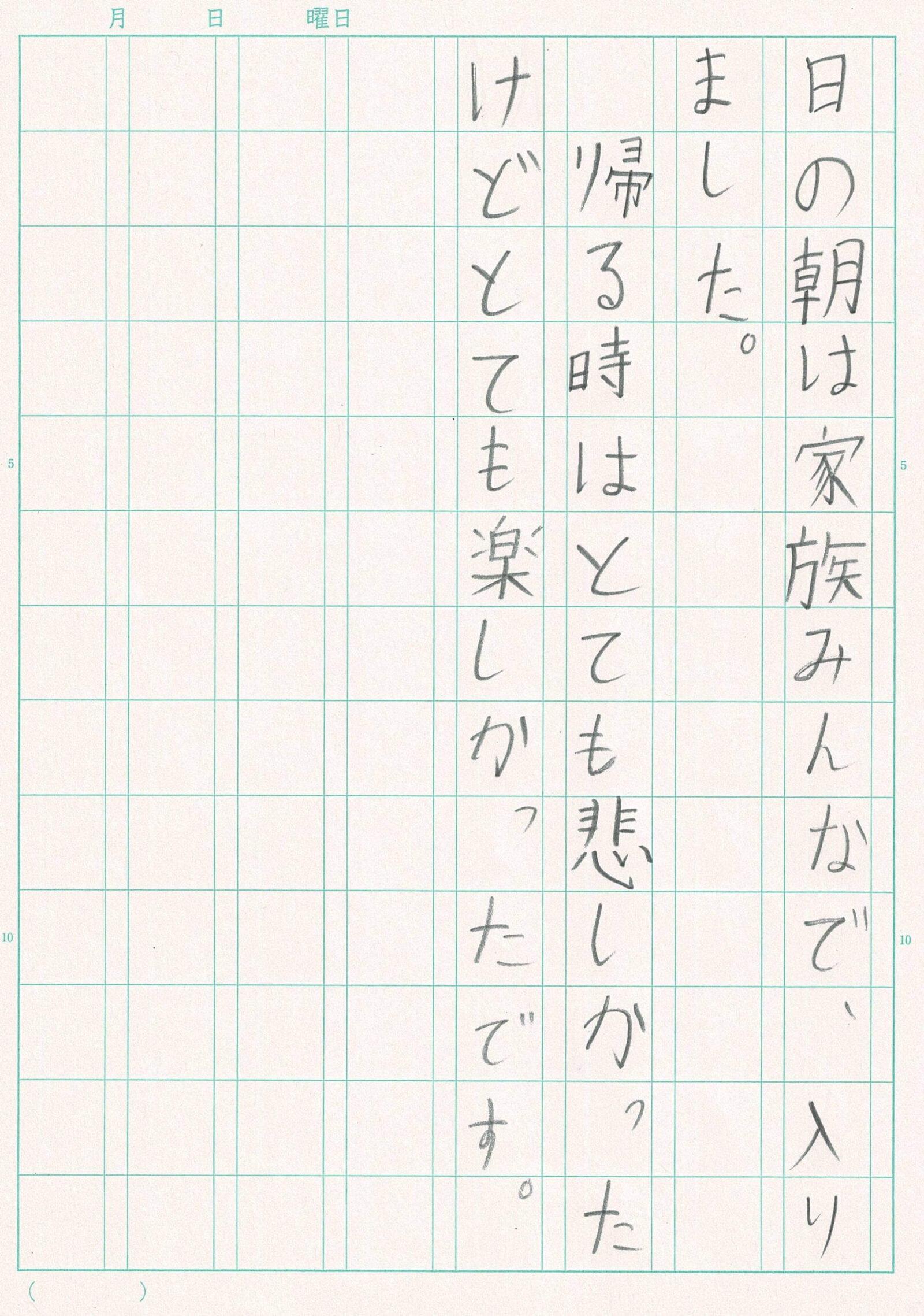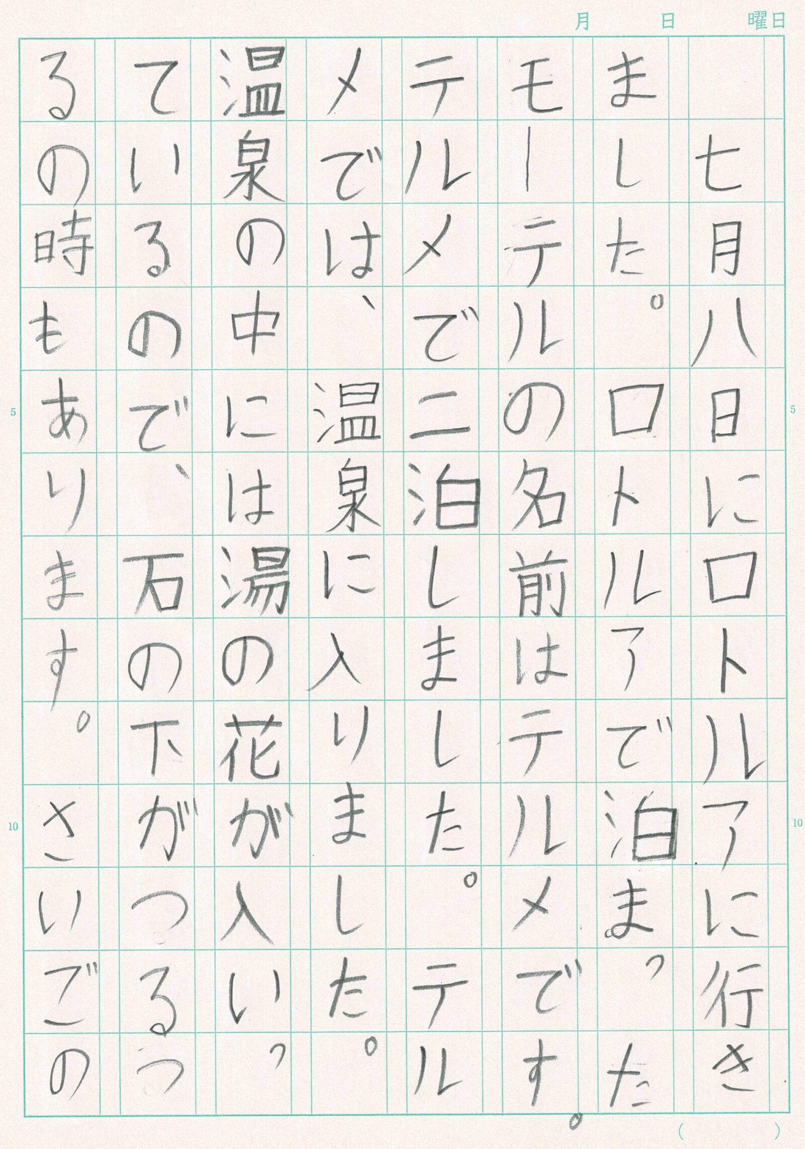 七月八日にロトルアに行きました。ロトルアで泊まったモーテルの名前はテルメです。テルメで二泊しました。テルメでは、温泉に入りました。温泉の中には湯の花が入っているので、石の下がつるつるの時もあります。さいごの日の朝は家族みんなで入りました。